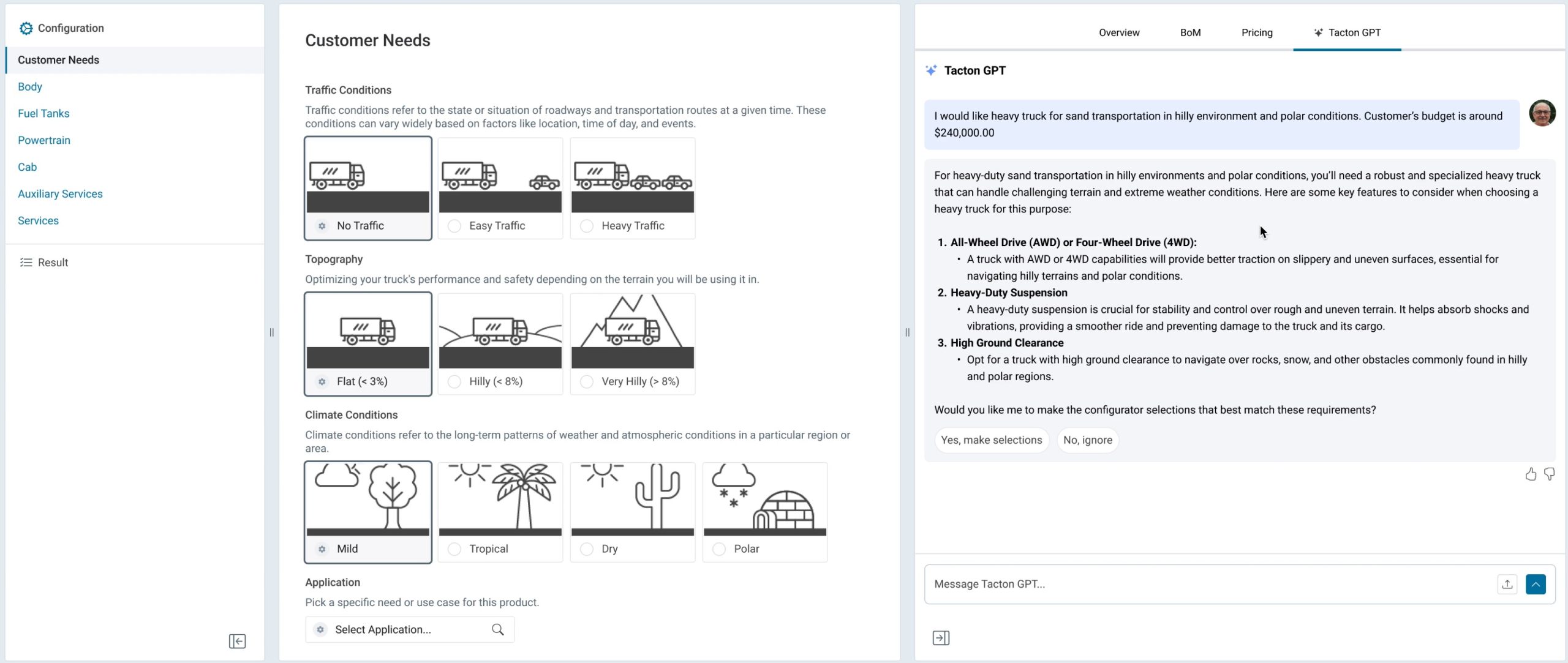 - Evolving portfolio. As we will see, AI can be used in multiple parts of the sales and product introduction process. Tacton will gradually release capabilities, listening and learning from those while moving to the next feature.