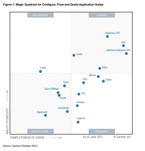 [“This graphic was published by Gartner, Inc. as part of a larger research document and should be evaluated in the context of the entire document. The Gartner document is available upon request from Tacton.” Gartner, Magic Quadrant for Configure, Price, and Quote Application Suites. Mark Lewis, Dayna Ford, , 21 October 2021]