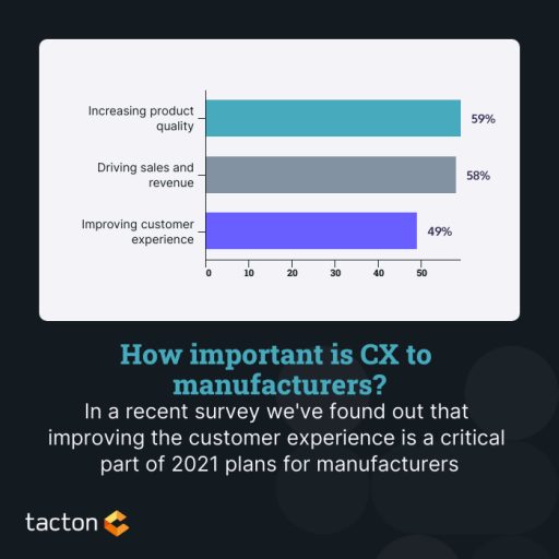 With 49% of respondents noting the importance of customer experience it’s time manufacturers begin taking a deep look at how to improve this aspect of their digital transformation. Driving sales and revenue is directly impacted by the customer experience.